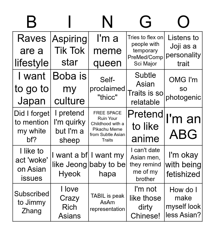This bingo card has a free space and 24 words: I want a bf like Jeong Hyeok, I love Crazy Rich Asians, Self-proclaimed "thicc", Subscribed to Jimmy Zhang, Listens to Joji as a personality trait, Raves are a lifestyle, I want to go to Japan, Aspiring Tik Tok star, Pretend to like anime, I want my baby to be hapa, Subtle Asian Traits is so relatable, Did I forget to mention my white bf?, I can't date Asian men, they remind me of my brother, I'm okay with being fetishized, Boba is my culture, I'm not like those dirty Chinese!, I'm an ABG, I'm a meme queen, OMG I'm so photogenic, I pretend I'm quirky but I'm a sheep, How do I make myself look less Asian?, I like to act 'woke' on Asian issues, Tries to flex on people with temporary PreMed/Comp Sci Major and TABIL is peak AsAm representation.