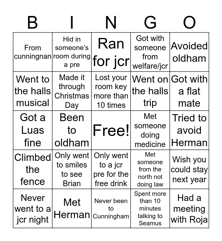 This bingo card has a free space and 24 words: Only went to smiles to see Brian, Met Herman, Lost your room key more than 10 times, Never went to a jcr night, Avoided oldham, From cunningnan, Went to the halls musical, Hid in someone’s room during a pre, Met someone doing medicine, Only went to a jcr pre for the free drink, Went on the halls trip, Got a Luas fine, Met someone from the north not doing law, Wish you could stay next year, Made it through Christmas Day, Spent more than 10 minutes talking to Seamus, Tried to avoid Herman, Ran for jcr, Got with a flat mate, Been to oldham, Had a meeting with Roja, Climbed the fence, Got with someone from welfare/jcr and Never been to Cunningham.