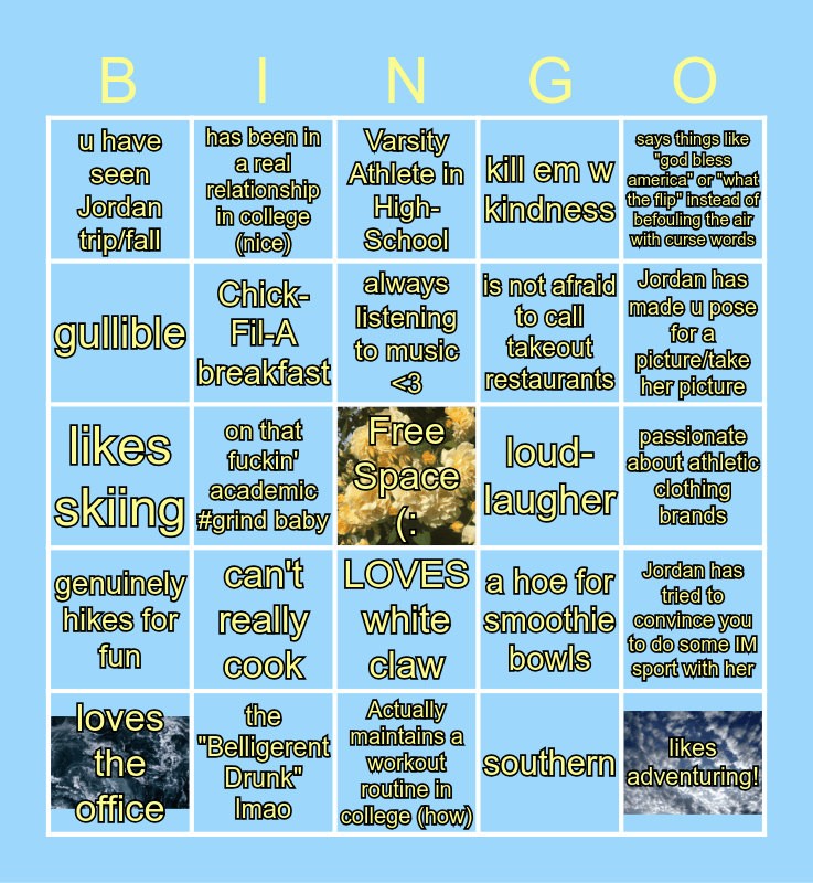 This bingo card has 2 images, a free space and 24 words: loves the office, can't really cook, always listening to music <3, southern, says things like "god bless america" or "what the flip" instead of befouling the air with curse words, u have seen Jordan trip/fall, has been in a real relationship in college (nice), Varsity Athlete in High-School, loud-laugher, passionate about athletic clothing brands, likes skiing, Chick-Fil-A breakfast, a hoe for smoothie bowls, Jordan has tried to convince you to do some IM sport with her, gullible, the "Belligerent Drunk" lmao, Actually maintains a workout routine in college (how), kill em w kindness, Jordan has made u pose for a picture/take her picture, genuinely hikes for fun, on that fuckin' academic #grind baby, LOVES white claw, is not afraid to call takeout restaurants and likes adventuring!.