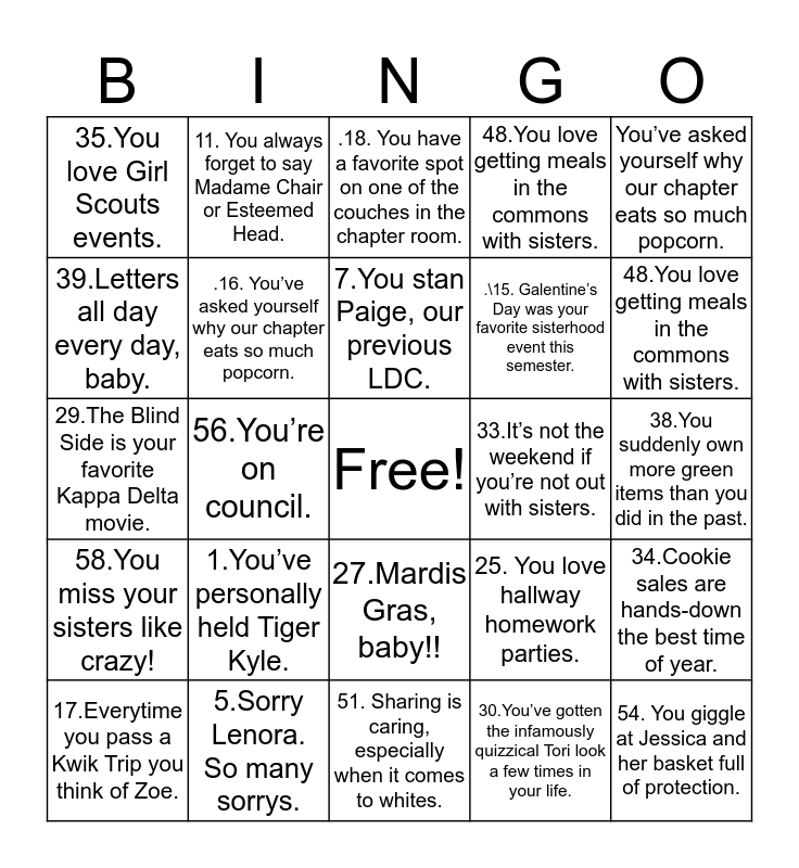 This bingo card has a free space and 24 words: 1.You’ve personally held Tiger Kyle., 5.Sorry Lenora. So many sorrys., 7.You stan Paige, our previous LDC., 17.Everytime you pass a Kwik Trip you think of Zoe., You’ve asked yourself why our chapter eats so much popcorn., 35.You love Girl Scouts events., 39.Letters all day every day, baby., 11. You always forget to say Madame Chair or Esteemed Head., 33.It’s not the weekend if you’re not out with sisters., 27.Mardis Gras, baby!!, .\15. Galentine’s Day was your favorite sisterhood event this semester., 29.The Blind Side is your favorite Kappa Delta movie., 25. You love hallway homework parties., 34.Cookie sales are hands-down the best time of year., .16. You’ve asked yourself why our chapter eats so much popcorn., 30.You’ve gotten the infamously quizzical Tori look a few times in your life., 38.You suddenly own more green items than you did in the past., .18. You have a favorite spot on one of the couches in the chapter room., 48.You love getting meals in the commons with sisters., 56.You’re on council., 54. You giggle at Jessica and her basket full of protection., 58.You miss your sisters like crazy!, 48.You love getting meals in the commons with sisters. and 51. Sharing is caring, especially when it comes to whites..