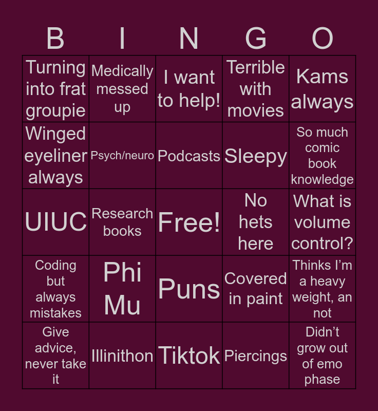 This bingo card has a free space and 24 words: Phi Mu, Illinithon, Podcasts, Give advice, never take it, Kams always, Turning into frat groupie, Winged eyeliner always, Medically messed up, No hets here, Puns, Sleepy, UIUC, Covered in paint, Thinks I’m a heavy weight, an not, Psych/neuro, Piercings, What is volume control?, I want to help!, So much comic book knowledge, Research books, Didn’t grow out of emo phase, Coding but always mistakes, Terrible with movies and Tiktok.