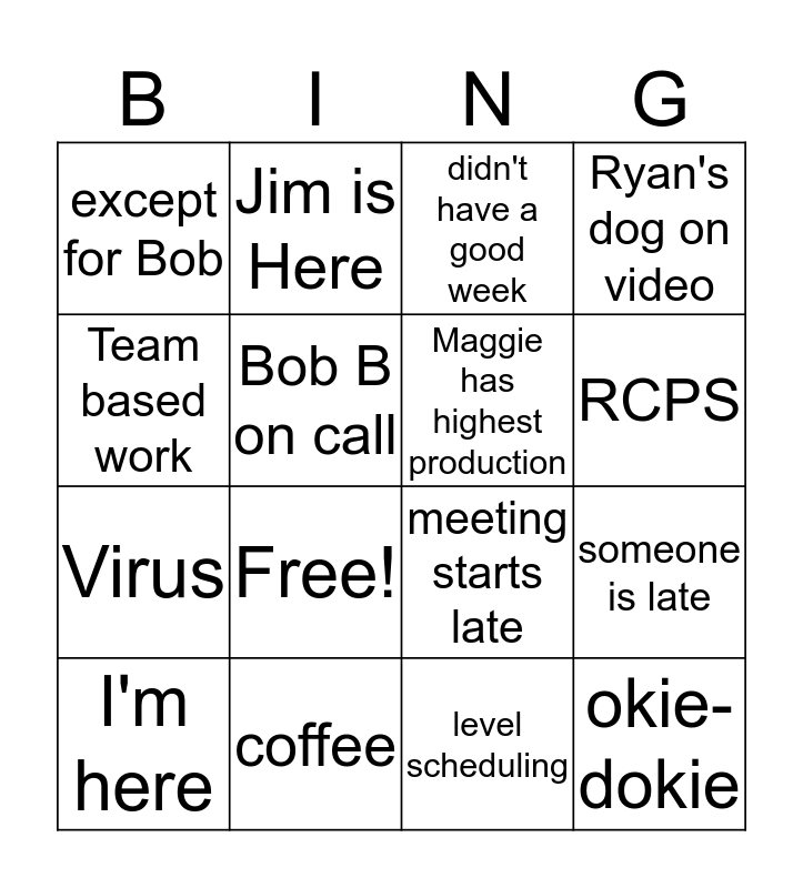 This bingo card has 16 words: coffee, someone is late, didn't have a good week, except for Bob, Virus, Jim is Here, meeting starts late, level scheduling, Team based work, Bob B on call, I'm here, Ryan's dog on video, Free!, RCPS, Maggie has highest production and okie-dokie.