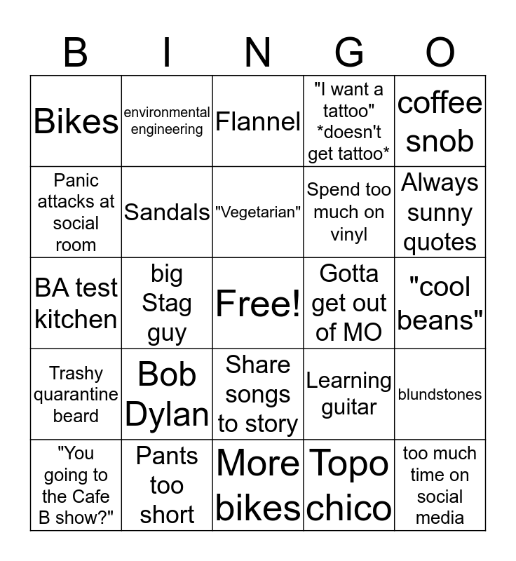 This bingo card has a free space and 24 words: Bob Dylan, Pants too short, "Vegetarian", "You going to the Cafe B show?", coffee snob, Bikes, Panic attacks at social room, environmental engineering, Gotta get out of MO, Share songs to story, Spend too much on vinyl, BA test kitchen, Learning guitar, blundstones, Sandals, Topo chico, "cool beans", Flannel, Always sunny quotes, big Stag guy, too much time on social media, Trashy quarantine beard, "I want a tattoo" *doesn't get tattoo* and More bikes.