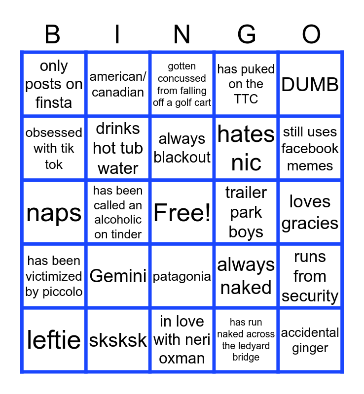 This bingo card has a free space and 24 words: Gemini, sksksk, always blackout, leftie, DUMB, only posts on finsta, obsessed with tik tok, american/ canadian, trailer park boys, patagonia, hates nic, naps, always naked, runs from security, drinks hot tub water, has run naked across the ledyard bridge, loves gracies, gotten concussed from falling off a golf cart, still uses facebook memes, has been called an alcoholic on tinder, accidental ginger, has been victimized by piccolo, has puked on the TTC and in love with neri oxman.