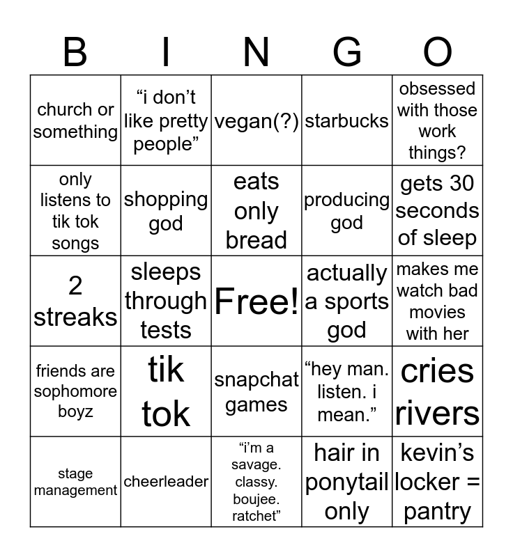 This bingo card has a free space and 24 words: tik tok, cheerleader, eats only bread, stage management, obsessed with those work things?, church or something, only listens to tik tok songs, “i don’t like pretty people”, actually a sports god, snapchat games, producing god, 2 streaks, “hey man. listen. i mean.”, cries rivers, shopping god, hair in ponytail only, makes me watch bad movies with her, vegan(?), gets 30 seconds of sleep, sleeps through tests, kevin’s locker = pantry, friends are sophomore boyz, starbucks and “i’m a savage. classy. boujee. ratchet”.
