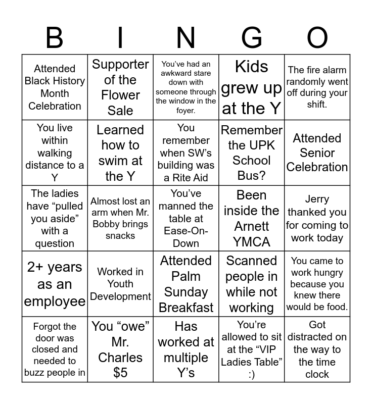This bingo card has 25 words: 2+ years as an employee, You “owe” Mr. Charles $5, You’ve manned the table at Ease-On-Down, You’re allowed to sit at the “VIP Ladies Table” :), The fire alarm randomly went off during your shift., Attended Black History Month Celebration, Supporter of the Flower Sale, You’ve had an awkward stare down with someone through the window in the foyer., Been inside the Arnett YMCA, You came to work hungry because you knew there would be food., You live within walking distance to a Y, Learned how to swim at the Y, Has worked at multiple Y’s, Scanned people in while not working, Attended Senior Celebration, Forgot the door was closed and needed to buzz people in, Almost lost an arm when Mr. Bobby brings snacks, You remember when SW’s building was a Rite Aid, Remember the UPK School Bus?, Jerry thanked you for coming to work today, The ladies have “pulled you aside” with a question, Worked in Youth Development, Attended Palm Sunday Breakfast, Kids grew up at the Y and Got distracted on the way to the time clock.