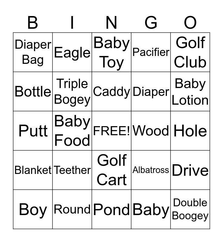 This bingo card has a free space and 63 words: Fairway, Tee, Pitch, Drive, Putter, Stroke, Eagle, Golf Ball, Caddy, Sand Trap, Golf Cart, Green, Hole, Golf Club, Birdie, Bottle, Baby Food, Diaper Bag, Bib, Diaper, Teether, Blanket, Pacifier, Mommy, Crib, Car Seat, Nursery, Stroller, Daddy, Stork, Baby Connor, Baby Swing, Booties, Onesie, Baby Lotion, Boy, Formula, Baby, Teeing Ground, Triple Bogey, Putt, Wood, Lay-Up, Hazards, Double Boogey, Round, Chip, Albatross, Golf Shoes, Golf Course, Putt, Pond, Flag, Eighteen, Baby Powder, Baby Toy, Changing Table, Bassinet, Pregnant, Feeding, Boy, High Chair and Wash Cloth.