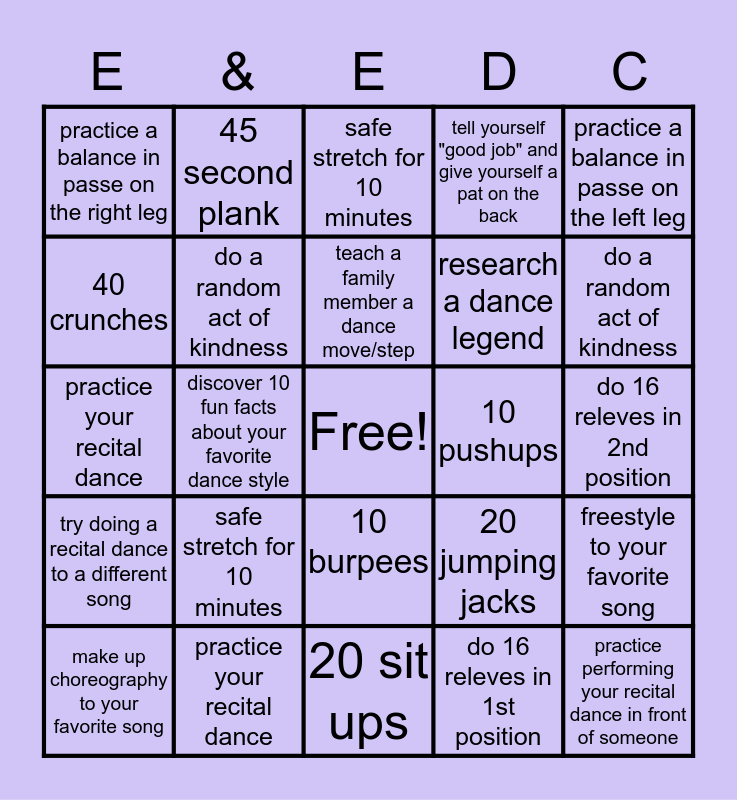 This bingo card has a free space and 24 words: safe stretch for 10 minutes, practice your recital dance, teach a family member a dance move/step, make up choreography to your favorite song, practice a balance in passe on the left leg, practice a balance in passe on the right leg, 40 crunches, 45 second plank, 10 pushups, 10 burpees, research a dance legend, practice your recital dance, 20 jumping jacks, freestyle to your favorite song, do a random act of kindness, do 16 releves in 1st position, do 16 releves in 2nd position, safe stretch for 10 minutes, do a random act of kindness, discover 10 fun facts about your favorite dance style, practice performing your recital dance in front of someone, try doing a recital dance to a different song, tell yourself "good job" and give yourself a pat on the back and 20 sit ups.