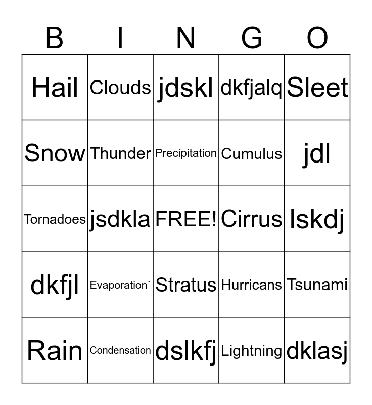 This bingo card has a free space and 24 words: Evaporation`, Condensation, Precipitation, Rain, Sleet, Hail, Snow, Clouds, Cirrus, Stratus, Cumulus, Tornadoes, Hurricans, Tsunami, Thunder, Lightning, lskdj, jdskl, jdl, jsdkla, dklasj, dkfjl, dkfjalq and dslkfj.