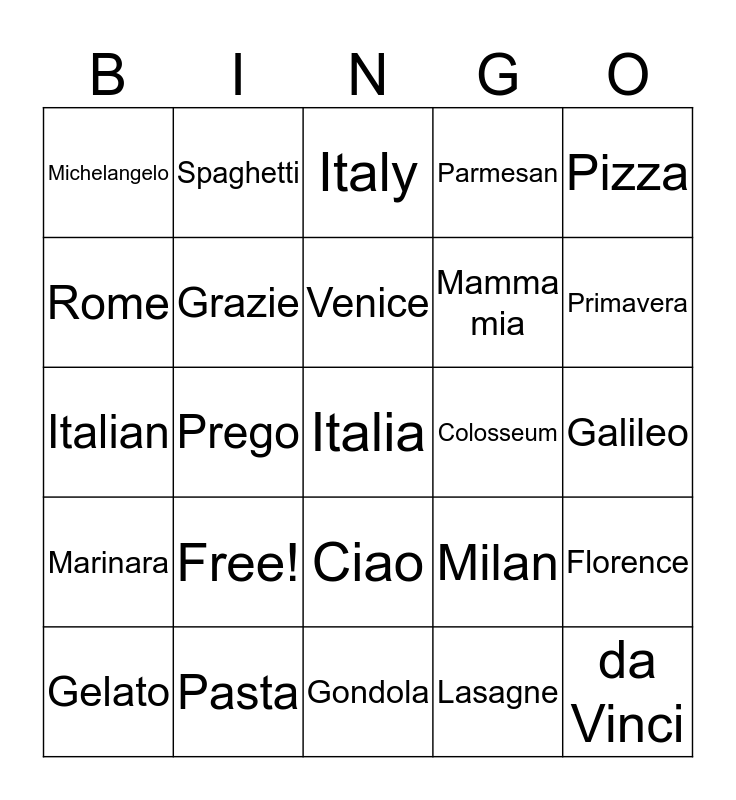 This bingo card has 25 words: Free!, Gondola, Venice, Gelato, Pizza, Michelangelo, Rome, Spaghetti, Colosseum, Ciao, Mamma mia, Italian, Milan, Florence, Grazie, da Vinci, Galileo, Italy, Primavera, Prego, Italia, Pasta, Marinara, Parmesan and Lasagne.