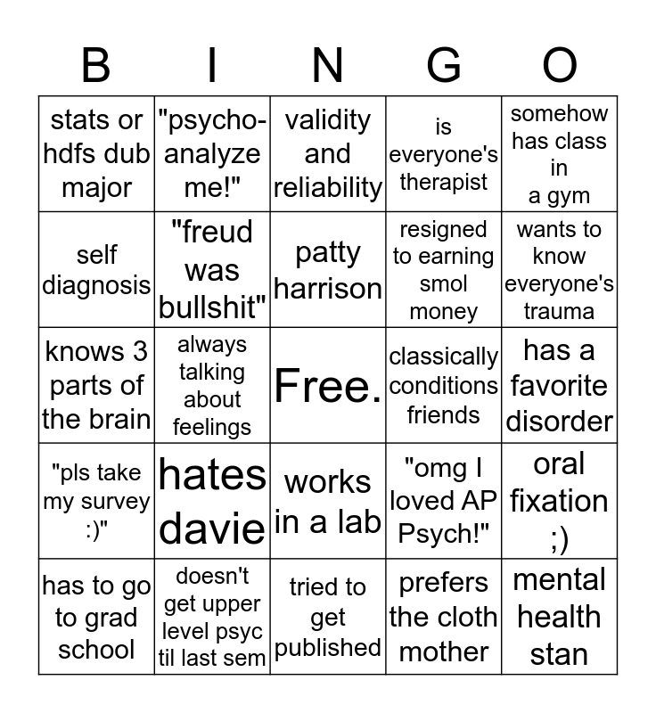 This bingo card has a free space and 24 words: hates davie, doesn't get upper level psyc til last sem, patty harrison, has to go to grad school, somehow has class in a gym, stats or hdfs dub major, self diagnosis, "psycho-analyze me!", classically conditions friends, works in a lab, resigned to earning smol money, knows 3 parts of the brain, "omg I loved AP Psych!", oral fixation ;), "freud was bullshit", prefers the cloth mother, has a favorite disorder, validity and reliability, wants to know everyone's trauma, always talking about feelings, mental health stan, "pls take my survey :)", is everyone's therapist and tried to get published.