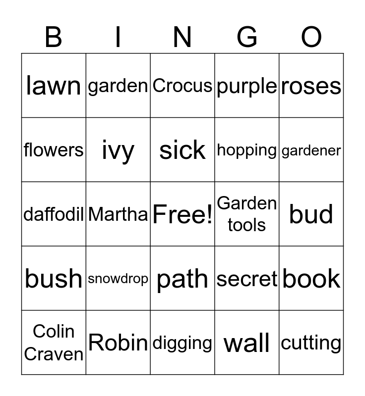 This bingo card has a free space and 29 words: Colin Craven, Dickon, Martha, Mary Lennox, lawn, Crocus, ivy, snowdrop, Garden tools, Robin, bud, cutting, digging, wall, gardener, Weeds, path, bush, roses, daffodil, secret, fountain, hopping, flowers, purple, garden, book, sick and bed.