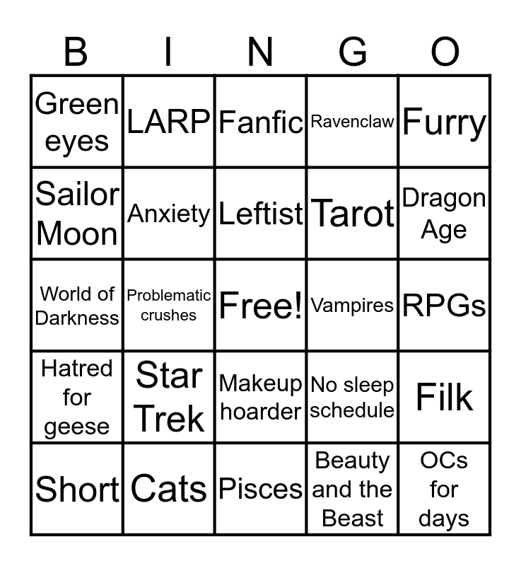 This bingo card has a free space and 24 words: Star Trek, Cats, Leftist, Short, Furry, Green eyes, Sailor Moon, LARP, Vampires, Makeup hoarder, Tarot, World of Darkness, No sleep schedule, Filk, Anxiety, Beauty and the Beast, RPGs, Fanfic, Dragon Age, Problematic crushes, OCs for days, Hatred for geese, Ravenclaw and Pisces.