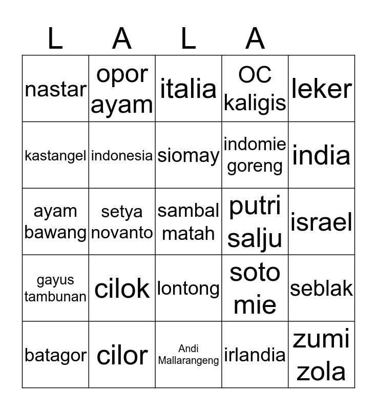 This bingo card has a free space and 24 words: cilok, cilor, siomay, batagor, leker, nastar, kastangel, opor ayam, putri salju, lontong, indomie goreng, ayam bawang, soto mie, seblak, indonesia, irlandia, israel, italia, india, setya novanto, zumi zola, gayus tambunan, OC kaligis and Andi Mallarangeng.
