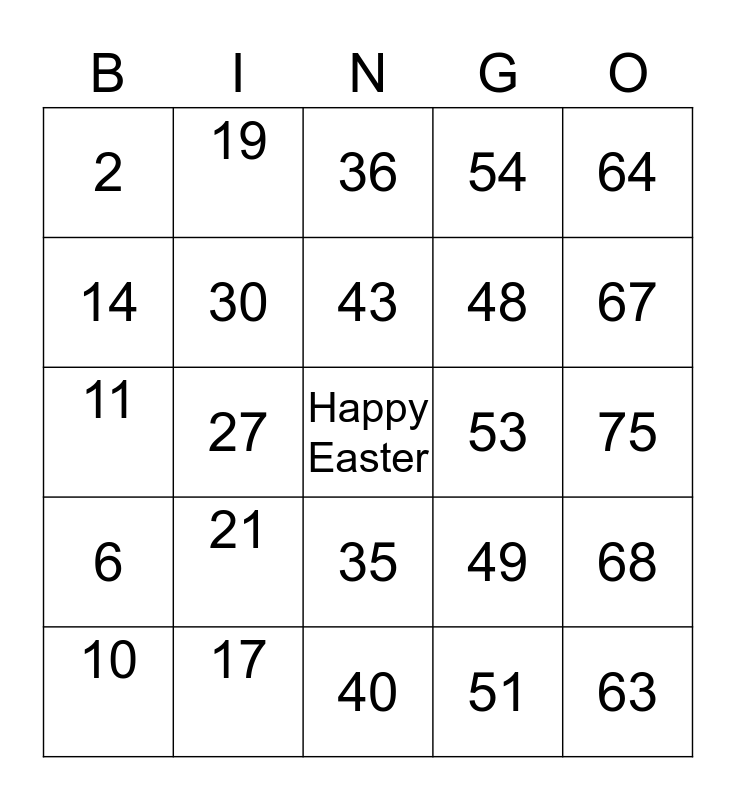 This bingo card has a free space and 24 words: 10, 21, 43, 51, 64, 2, 19, 36, 53, 75, 11, 30, 49, 68, 14, 17, 40, 54, 67, 6, 27, 35, 48 and 63.