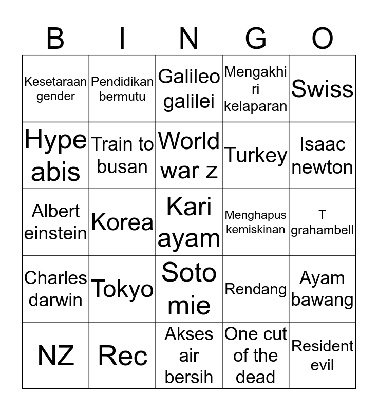 This bingo card has 25 words: Tokyo, Akses air bersih, World war z, NZ, Swiss, Kesetaraan gender, Hype abis, Pendidikan bermutu, Menghapus kemiskinan, Soto mie, Turkey, Albert einstein, Rendang, Ayam bawang, Train to busan, Resident evil, T grahambell, Galileo galilei, Isaac newton, Korea, Kari ayam, Rec, Charles darwin, Mengakhi ri kelaparan and One cut of the dead.