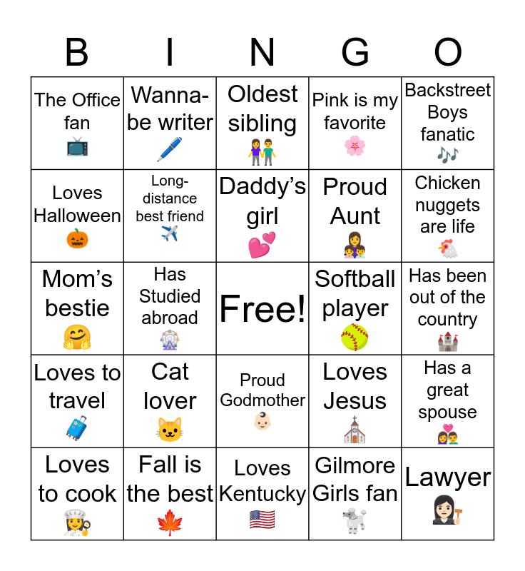 This bingo card has a free space and 24 words: Cat lover π±, Fall is the best π, Daddyβs girl π, Loves to cook π©βπ³, Backstreet Boys fanatic πΆ, The Office fan πΊ, Loves Halloween π, Wanna-be writer π, Softball player π₯, Proud Godmother πΆπ», Proud Aunt π©βπ§βπ¦, Momβs bestie π€, Loves Jesus βͺοΈ, Has a great spouse π©ββ€οΈβπ¨, Long-distance best friend βοΈ, Gilmore Girls fan π©, Has been out of the country π°, Oldest sibling π«, Chicken nuggets are life π, Has Studied abroad π‘, Lawyer π©π»ββοΈ, Loves to travel π§³, Pink is my favorite πΈ and Loves Kentucky πΊπΈ.