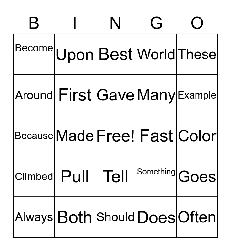 This bingo card has a free space and 29 words: Always, Feather, Made, Island, Become, Best, First, Pull, Fast, Both, Color, Often, Should, Does, Example, Before, Tell, Climbed, These, Because, Something, Heard, Many, Around, World, Upon, Goes, Gave and Wish.