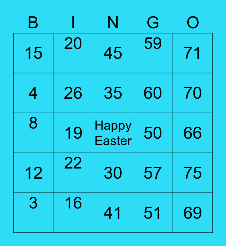 This bingo card has a free space and 24 words: 3, 22, 35, 51, 71, 15, 20, 45, 50, 66, 8, 26, 57, 75, 4, 16, 41, 59, 70, 12, 19, 30, 60 and 69.