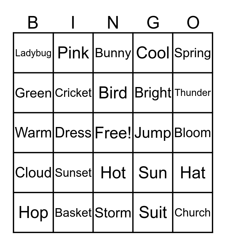 This bingo card has a free space and 29 words: Egg, Basket, Bunny, Hunt, Spring, Ladybug, Cricket, Bird, Jump, Hat, Hop, Dress, Suit, Church, Warm, Rain, Storm, Sun, Thunder, Cloud, Sunset, Sundown, Bright, Bloom, Green, Pink, Hot, Cool and Moon.