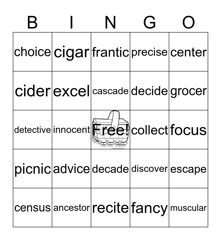 This bingo card has a free space and 24 words: advice, ancestor, cascade, census, center, choice, cider, cigar, collect, decade, decide, detective, discover, escape, excel, fancy, focus, frantic, grocer, innocent, muscular, picnic, precise and recite.