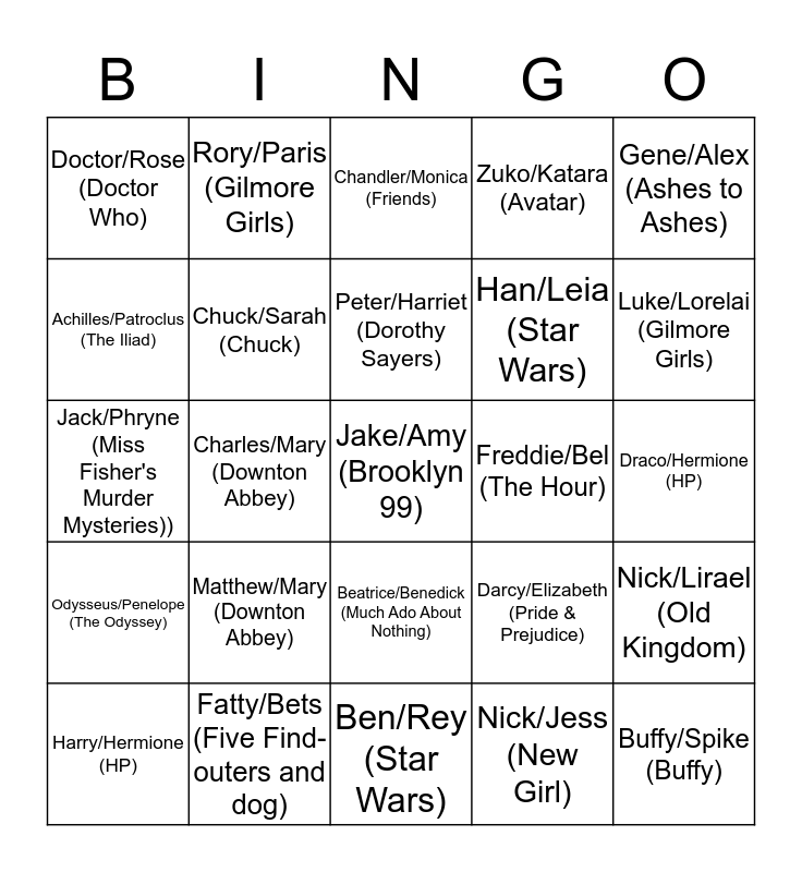 This bingo card has 25 words: Matthew/Mary (Downton Abbey), Ben/Rey (Star Wars), Peter/Harriet (Dorothy Sayers), Harry/Hermione (HP), Gene/Alex (Ashes to Ashes), Doctor/Rose (Doctor Who), Achilles/Patroclus (The Iliad), Rory/Paris (Gilmore Girls), Freddie/Bel (The Hour), Beatrice/Benedick (Much Ado About Nothing), Han/Leia (Star Wars), Jack/Phryne (Miss Fisher's Murder Mysteries)), Darcy/Elizabeth (Pride & Prejudice), Nick/Lirael (Old Kingdom), Chuck/Sarah (Chuck), Buffy/Spike (Buffy), Draco/Hermione (HP), Chandler/Monica (Friends), Luke/Lorelai (Gilmore Girls), Charles/Mary (Downton Abbey), Jake/Amy (Brooklyn 99), Fatty/Bets (Five Find-outers and dog), Odysseus/Penelope (The Odyssey), Zuko/Katara (Avatar) and Nick/Jess (New Girl).