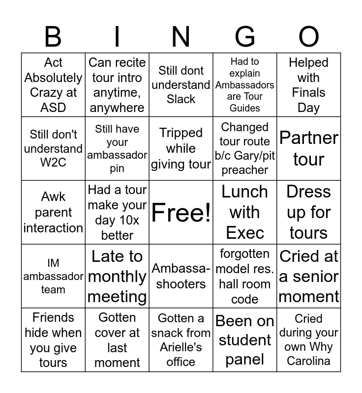 This bingo card has a free space and 24 words: Late to monthly meeting, Gotten cover at last moment, Tripped while giving tour, Friends hide when you give tours, Helped with Finals Day, Act Absolutely Crazy at ASD, Still don't understand W2C, Can recite tour intro anytime, anywhere, Lunch with Exec, Ambassa-shooters, Changed tour route b/c Gary/pit preacher, Awk parent interaction, forgotten model res. hall room code, Cried at a senior moment, Still have your ambassador pin, Been on student panel, Dress up for tours, Still dont understand Slack, Partner tour, Had a tour make your day 10x better, Cried during your own Why Carolina, IM ambassador team, Had to explain Ambassadors are Tour Guides and Gotten a snack from Arielle's office.