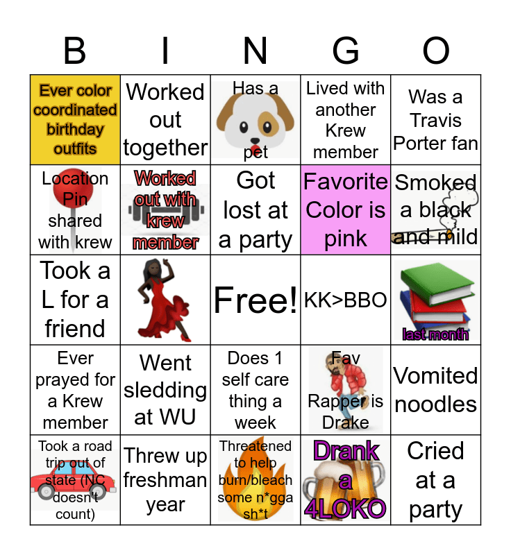 This bingo card has 10 images, a free space and 23 words: Took a road trip out of state (NC doesn't count), Went sledding at WU, Got lost at a party, Drank a 4LOKO, Was a Travis Porter fan, Ever color coordinated birthday outfits, Worked out together, Has a pet, KK>BBO, last month, Took a L for a friend, Worked out with krew member, Fav Rapper is Drake, Vomited noodles, Location Pin shared with krew, Threw up freshman year, Threatened to help burn/bleach some n*gga sh*t, Lived with another Krew member, Smoked a black and mild, Ever prayed for a Krew member, Does 1 self care thing a week, Favorite Color is pink and Cried at a party.