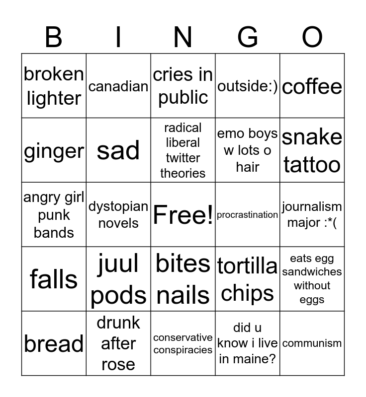 This bingo card has a free space and 25 words: juul pods, conservative conspiracies, radical liberal twitter theories, bread, coffee, broken lighter, ginger, canadian, procrastination, bites nails, emo boys w lots o hair, angry girl punk bands, tortilla chips, eats egg sandwiches without eggs, sad, broke, journalism major :*(, cries in public, snake tattoo, dystopian novels, communism, drunk after rose, falls, outside:) and did u know i live in maine?.