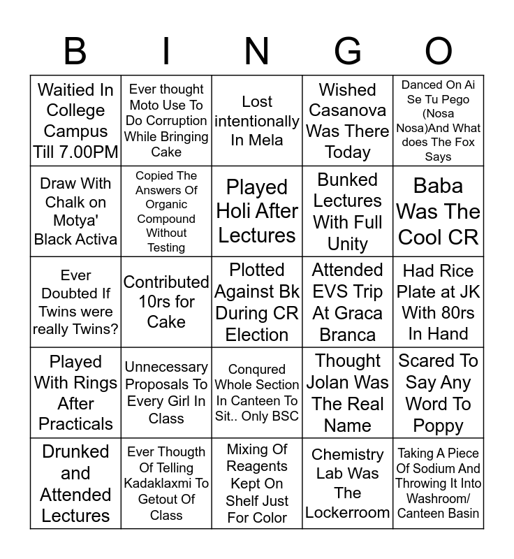 This bingo card has a free space and 24 words: Unnecessary Proposals To Every Girl In Class, Ever Thougth Of Telling Kadaklaxmi To Getout Of Class, Played Holi After Lectures, Drunked and Attended Lectures, Danced On Ai Se Tu Pego (Nosa Nosa)And What does The Fox Says, Waitied In College Campus Till 7.00PM, Draw With Chalk on Motya' Black Activa, Ever thought Moto Use To Do Corruption While Bringing Cake, Attended EVS Trip At Graca Branca, Conqured Whole Section In Canteen To Sit.. Only BSC, Bunked Lectures With Full Unity, Ever Doubted If Twins were really Twins?, Thought Jolan Was The Real Name, Scared To Say Any Word To Poppy, Copied The Answers Of Organic Compound Without Testing, Chemistry Lab Was The Lockerroom, Had Rice Plate at JK With 80rs In Hand, Lost intentionally In Mela, Baba Was The Cool CR, Contributed 10rs for Cake, Taking A Piece Of Sodium And Throwing It Into Washroom/ Canteen Basin, Played With Rings After Practicals, Wished Casanova Was There Today and Mixing Of Reagents Kept On Shelf Just For Color.