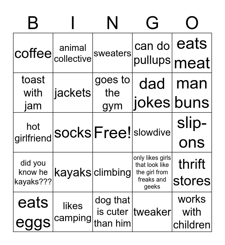 This bingo card has a free space and 24 words: kayaks, likes camping, goes to the gym, eats eggs, eats meat, coffee, toast with jam, animal collective, slowdive, climbing, dad jokes, hot girlfriend, only likes girls that look like the girl from freaks and geeks, thrift stores, jackets, tweaker, slip-ons, sweaters, man buns, socks, works with children, did you know he kayaks???, can do pullups and dog that is cuter than him.