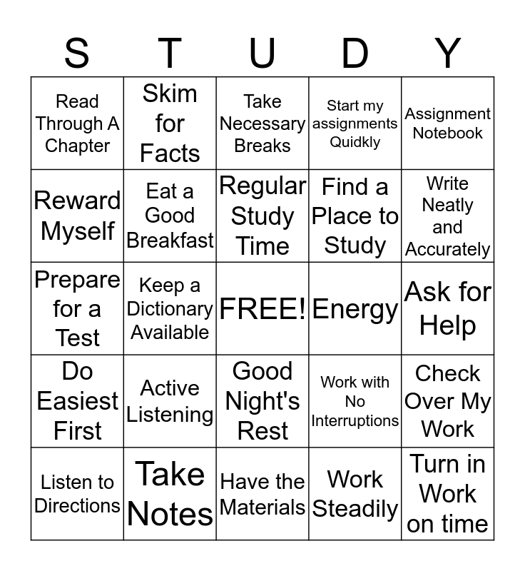 This bingo card has a free space and 24 words: Active Listening, Take Notes, Regular Study Time, Listen to Directions, Assignment Notebook, Read Through A Chapter, Reward Myself, Skim for Facts, Energy, Good Night's Rest, Find a Place to Study, Prepare for a Test, Work with No Interruptions, Check Over My Work, Eat a Good Breakfast, Work Steadily, Ask for Help, Take Necessary Breaks, Write Neatly and Accurately, Keep a Dictionary Available, Turn in Work on time, Do Easiest First, Start my assignments Quidkly and Have the Materials.
