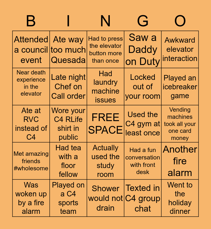 This bingo card has a free space and 24 words: Had tea with a floor fellow, Played on a C4 sports team, Had laundry machine issues, Was woken up by a fire alarm, Awkward elevator interaction, Attended a council event, Near death experience in the elevator, Ate way too much Quesada, Used the C4 gym at least once, Actually used the study room, Locked out of your room, Ate at RVC instead of C4, Had a fun conversation with front desk, Another fire alarm, Late night Chef on Call order, Texted in C4 group chat, Vending machines took all your one card money, Had to press the elevator button more than once, Played an icebreaker game, Wore your C4 RLife shirt in public, Went to the holiday dinner, Met amazing friends #wholesome, Saw a Daddy on Duty and Shower would not drain.