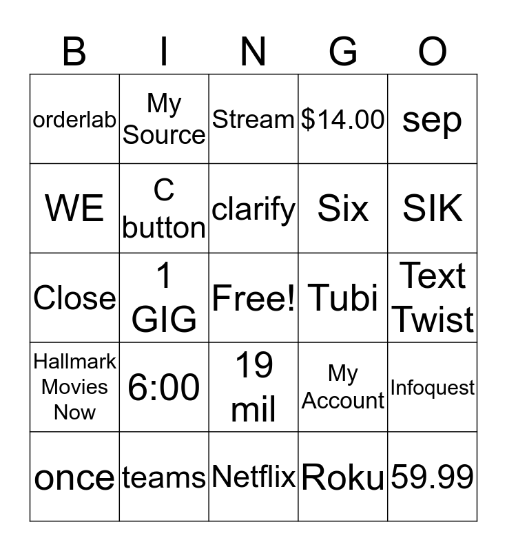 This bingo card has a free space and 24 words: 6:00, teams, clarify, once, sep, orderlab, WE, My Source, Tubi, 19 mil, Six, Close, My Account, Infoquest, C button, Roku, Text Twist, Stream, SIK, 1 GIG, 59.99, Hallmark Movies Now, $14.00 and Netflix.