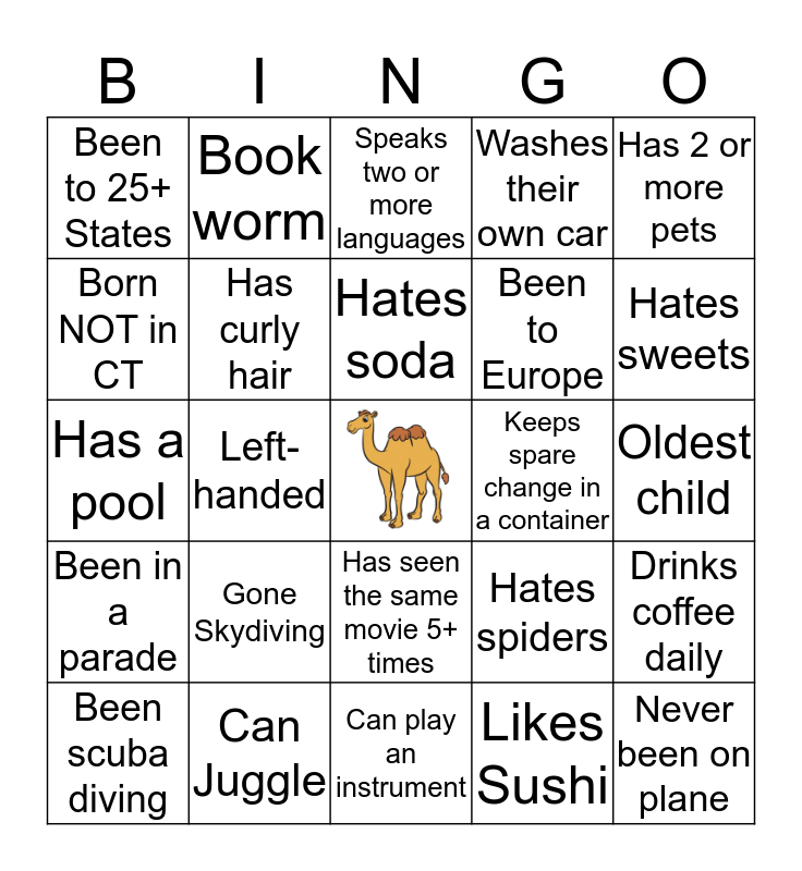 This bingo card has a free space and 24 words: Gone Skydiving, Can Juggle, Hates soda, Been scuba diving, Has 2 or more pets, Been to 25+ States, Born NOT in CT, Book worm, Keeps spare change in a container, Has seen the same movie 5+ times, Been to Europe, Has a pool, Hates spiders, Drinks coffee daily, Has curly hair, Likes Sushi, Oldest child, Speaks two or more languages, Hates sweets, Left-handed, Never been on plane, Been in a parade, Washes their own car and Can play an instrument.