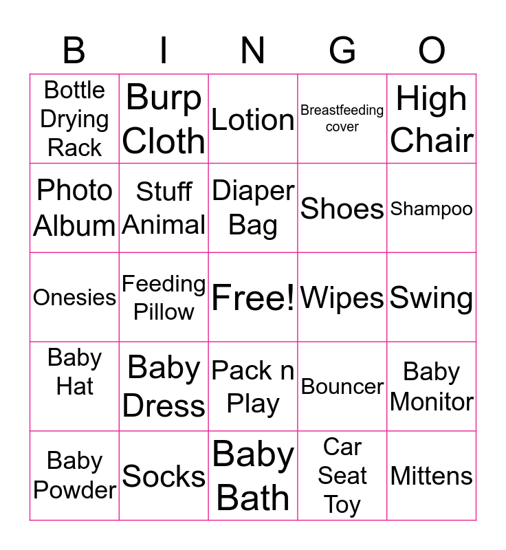 This bingo card has a free space and 34 words: Brush and Comb, Car Seat Toy, Pacifier, Diapers, Baby Hat, Stuff Animal, High Chair, Baby Powder, Burp Cloth, Bib, Diaper Bag, Lotion, Blanket, Bottle, Wipes, Shampoo, Socks, Onesies, Baby Dress, Bouncer, Pack n Play, Bottle Brush, Bottle Drying Rack, Swing, Baby Bath, Mittens, Breastfeeding cover, Night Light, Shoes, Photo Album, Car Seat Mirror, Feeding Pillow, Baby Monitor and Teether.