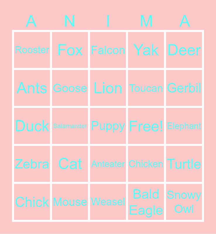 This bingo card has a free space and 24 words: Cat, Mouse, Lion, Chick, Deer, Rooster, Ants, Fox, Free!, Anteater, Toucan, Duck, Chicken, Turtle, Goose, Bald Eagle, Elephant, Falcon, Gerbil, Salamander, Snowy Owl, Zebra, Yak and Weasel.
