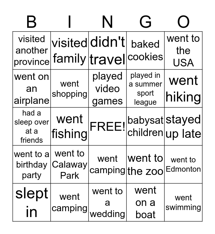 This bingo card has a free space and 24 words: went to Calaway Park, went camping, played video games, slept in, went to the USA, visited another province, went on an airplane, visited family, babysat children, went camping, played in a summer sport league, had a sleep over at a friends, went to the zoo, went to Edmonton, went shopping, went on a boat, stayed up late, didn't travel, went hiking, went fishing, went swimming, went to a birthday party, baked cookies and went to a wedding.