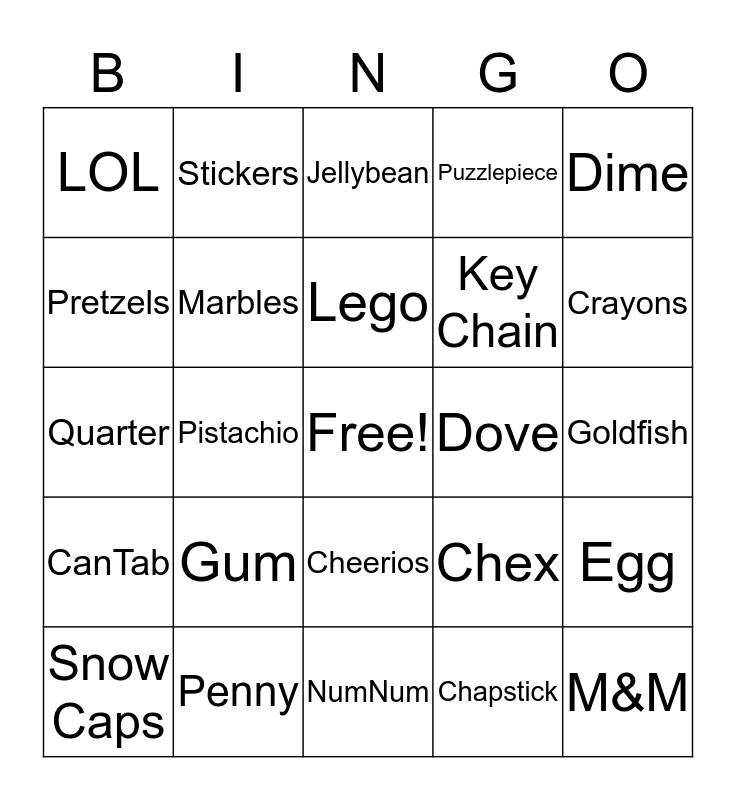 This bingo card has a free space and 24 words: Gum, Penny, Lego, Snow Caps, Dime, LOL, Pretzels, Stickers, Dove, Cheerios, Key Chain, Quarter, Chex, Egg, Marbles, Chapstick, Goldfish, Jellybean, Crayons, Pistachio, M&M, CanTab, Puzzlepiece and NumNum.