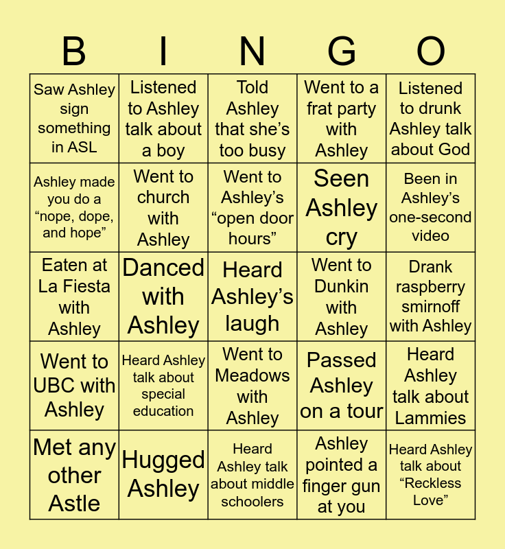 This bingo card has a free space and 24 words: Heard Ashley talk about special education, Hugged Ashley, Went to Ashley’s “open door hours”, Met any other Astle, Listened to drunk Ashley talk about God, Saw Ashley sign something in ASL, Ashley made you do a “nope, dope, and hope”, Listened to Ashley talk about a boy, Went to Dunkin with Ashley, Went to Meadows with Ashley, Seen Ashley cry, Eaten at La Fiesta with Ashley, Passed Ashley on a tour, Heard Ashley talk about Lammies, Went to church with Ashley, Ashley pointed a finger gun at you, Drank raspberry smirnoff with Ashley, Told Ashley that she’s too busy, Been in Ashley’s one-second video, Danced with Ashley, Heard Ashley talk about “Reckless Love”, Went to UBC with Ashley, Went to a frat party with Ashley and Heard Ashley talk about middle schoolers.