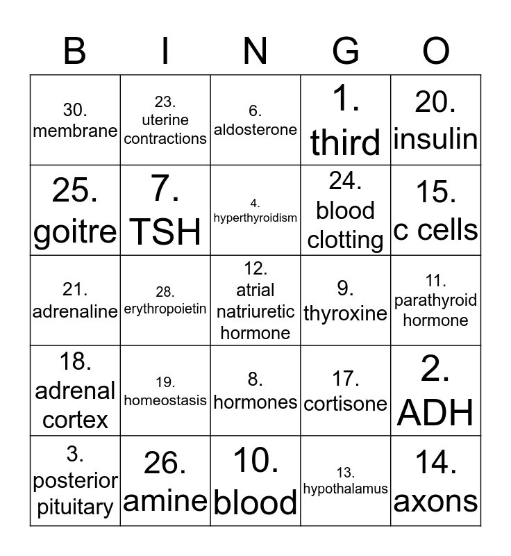 This bingo card has 30 words: 26. amine, 27. kidney, 28. erythropoietin, 29. progesterone, 30. membrane, 6. aldosterone, 7. TSH, 8. hormones, 9. thyroxine, 10. blood, 11. parathyroid hormone, 12. atrial natriuretic hormone, 13. hypothalamus, 14. axons, 15. c cells, 16. steroid, 17. cortisone, 18. adrenal cortex, 19. homeostasis, 20. insulin, 21. adrenaline, 22. T3 and T4, 23. uterine contractions, 24. blood clotting, 25. goitre, 1. third, 2. ADH, 3. posterior pituitary, 4. hyperthyroidism and 5. calcitonin.