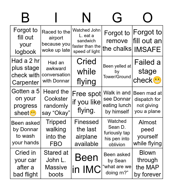 This bingo card has a free space and 24 words: Tripped walking into the FBO, Stared at John L. Massive boots, Cried while flying, Cried in your car after a bad flight, Forgot to fill out an IMSAFE, Forgot to fill out your logbook, Had a 2 hr plus stage check with Carpenter, Raced to the airport because you woke up late, Walk in and see Donnar eating lunch by himself, Finessed the last airplane available, Been yelled at by Tower/Ground, Gotten a 5 on your progress sheet😬, Watched Sean D. furiously tap his pen into oblivion, Almost peed yourself while flying, Had an awkward conversation with Donnar, Been asked by Sean “what are we doing rn?”, Been mad at dispatch for not giving you a plane, Watched John L. eat a sandwich faster than the speed of light, Failed a stage check😬, Heard the Cookster randomly say “Okay”, Blown through the MAP by forever, Been asked by Donnar to wash your hands, Forgot to remove the chalks and Been in IMC.