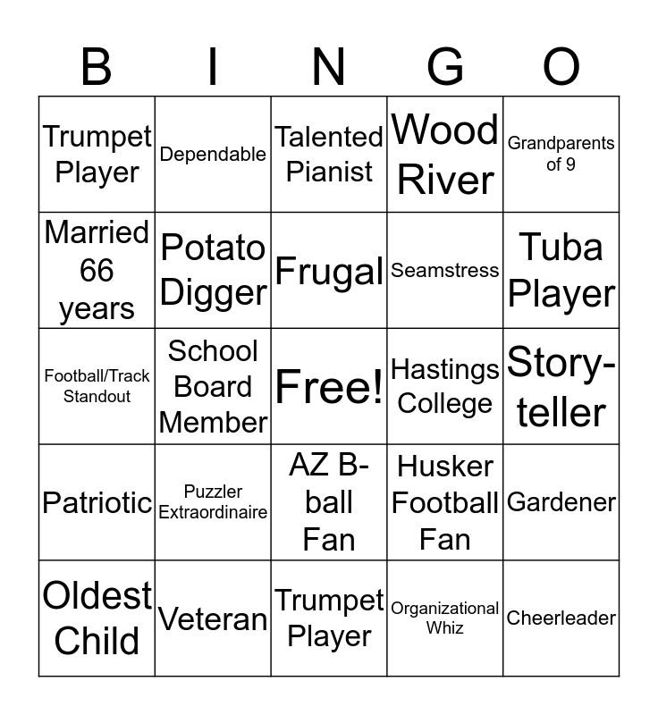 This bingo card has a free space and 29 words: Oldest Child, Teacher, School Board Member, Exceptional Speller, Trumpet Player, Talented Pianist, Potato Digger, Puzzler Extraordinaire, Hastings College, Veteran, Story-teller, Cheerleader, Trumpet Player, Organizational Whiz, Tuba Player, Hardworking, AZ B-ball Fan, Patriotic, Grandparents of 9, Football/Track Standout, Husker Football Fan, Funeral Director, Seamstress, Married 66 years, Wood River, Dependable, Gardener, Frugal and Generous.