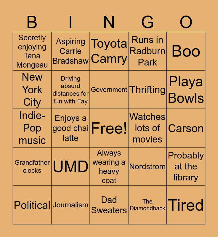 This bingo card has a free space and 24 words: UMD, Journalism, Government, Political, Boo, Secretly enjoying Tana Mongeau, New York City, Aspiring Carrie Bradshaw, Watches lots of movies, Always wearing a heavy coat, Thrifting, Indie-Pop music, Nordstrom, Probably at the library, Driving absurd distances for fun with Fay, The Diamondback, Carson, Toyota Camry, Playa Bowls, Enjoys a good chai latte, Tired, Grandfather clocks, Runs in Radburn Park and Dad Sweaters.
