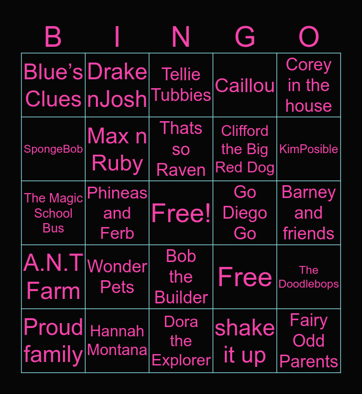 This bingo card has a free space and 25 words: Wonder Pets, Dora the Explorer, Thats so Raven, Proud family, Corey in the house, Blue’s Clues, SpongeBob, Drake nJosh, Go Diego Go, Bob the Builder, Clifford the Big Red Dog, The Magic School Bus, Free, The Doodlebops, Max n Ruby, Rugrats, Barney and friends, Tellie Tubbies, KimPosible, Phineas and Ferb, Fairy Odd Parents, Hannah Montana, A.N.T Farm, Caillou and shake it up.