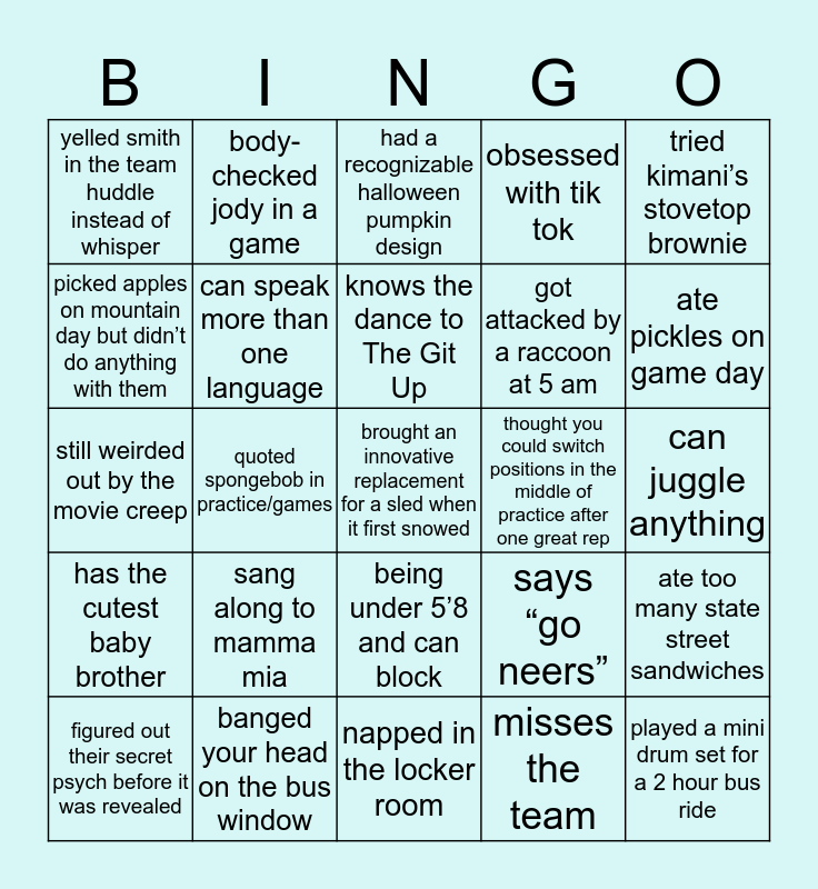 This bingo card has 25 words: sang along to mamma mia, napped in the locker room, knows the dance to The Git Up, figured out their secret psych before it was revealed, tried kimani’s stovetop brownie, yelled smith in the team huddle instead of whisper, picked apples on mountain day but didn’t do anything with them, body-checked jody in a game, thought you could switch positions in the middle of practice after one great rep, being under 5’8 and can block, got attacked by a raccoon at 5 am, still weirded out by the movie creep, says “go neers”, ate too many state street sandwiches, can speak more than one language, played a mini drum set for a 2 hour bus ride, can juggle anything, had a recognizable halloween pumpkin design, ate pickles on game day, quoted spongebob in practice/games, brought an innovative replacement for a sled when it first snowed, banged your head on the bus window, has the cutest baby brother, obsessed with tik tok and misses the team.