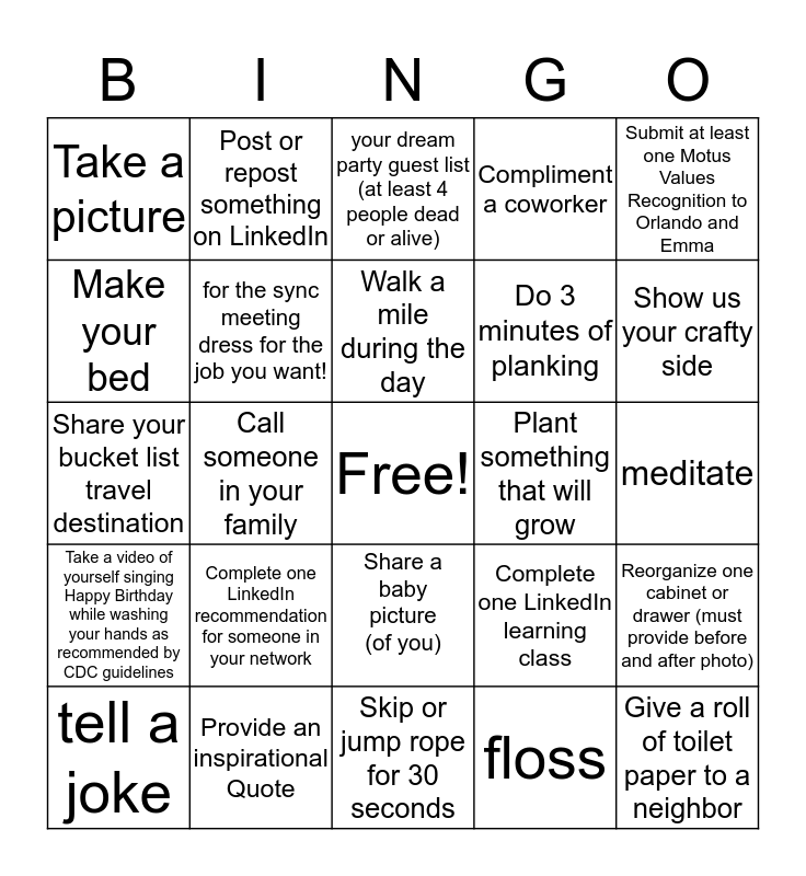 This bingo card has a free space and 24 words: Complete one LinkedIn recommendation for someone in your network, Provide an inspirational Quote, Walk a mile during the day, tell a joke, Submit at least one Motus Values Recognition to Orlando and Emma, Take a picture, Make your bed, Post or repost something on LinkedIn, Plant something that will grow, Share a baby picture (of you), Do 3 minutes of planking, Share your bucket list travel destination, Complete one LinkedIn learning class, Reorganize one cabinet or drawer (must provide before and after photo), for the sync meeting dress for the job you want!, floss, meditate, your dream party guest list (at least 4 people dead or alive), Show us your crafty side, Call someone in your family, Give a roll of toilet paper to a neighbor, Take a video of yourself singing Happy Birthday while washing your hands as recommended by CDC guidelines, Compliment a coworker and Skip or jump rope for 30 seconds.