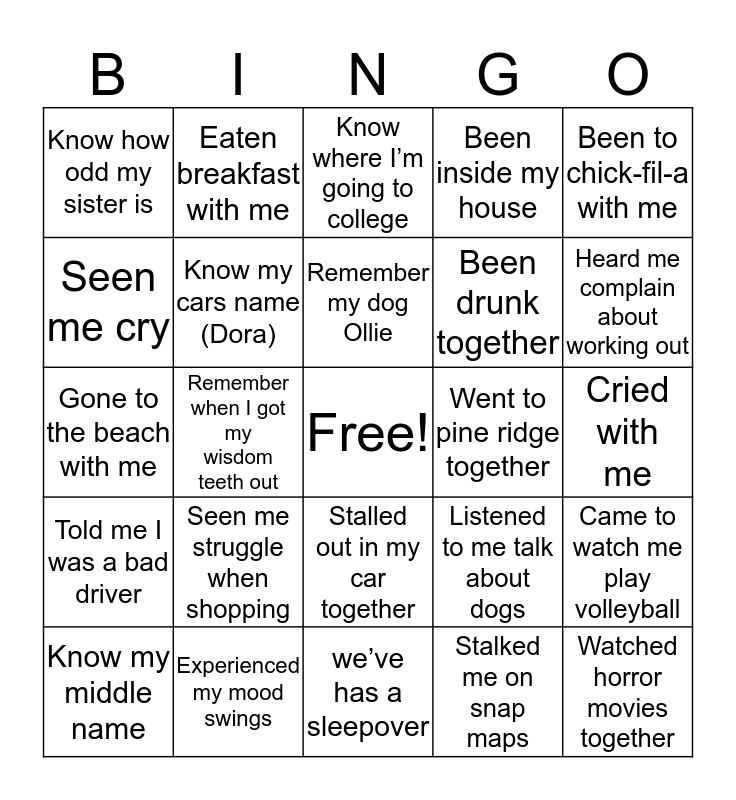 This bingo card has a free space and 24 words: Seen me struggle when shopping, Experienced my mood swings, Remember my dog Ollie, Know my middle name, Been to chick-fil-a with me, Know how odd my sister is, Seen me cry, Eaten breakfast with me, Went to pine ridge together, Stalled out in my car together, Been drunk together, Gone to the beach with me, Listened to me talk about dogs, Came to watch me play volleyball, Know my cars name (Dora), Stalked me on snap maps, Cried with me, Know where I’m going to college, Heard me complain about working out, Remember when I got my wisdom teeth out, Watched horror movies together, Told me I was a bad driver, Been inside my house and we’ve has a sleepover.