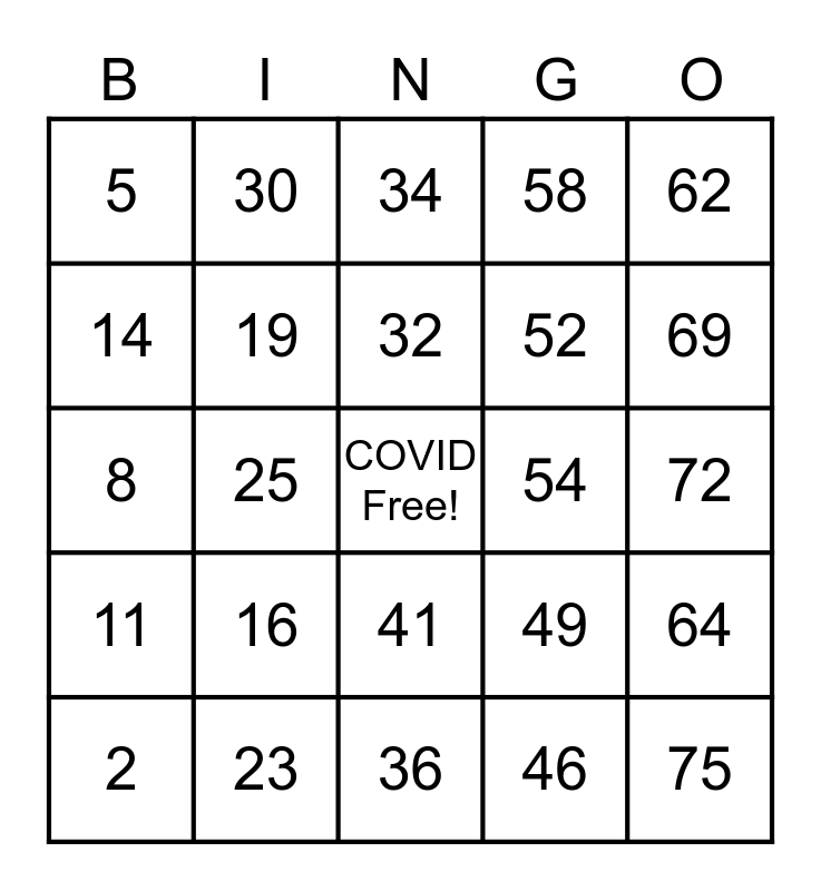 This bingo card has a free space and 24 words: 2, 16, 32, 46, 62, 5, 30, 34, 54, 72, 8, 19, 49, 64, 14, 23, 36, 58, 69, 11, 25, 41, 52 and 75.