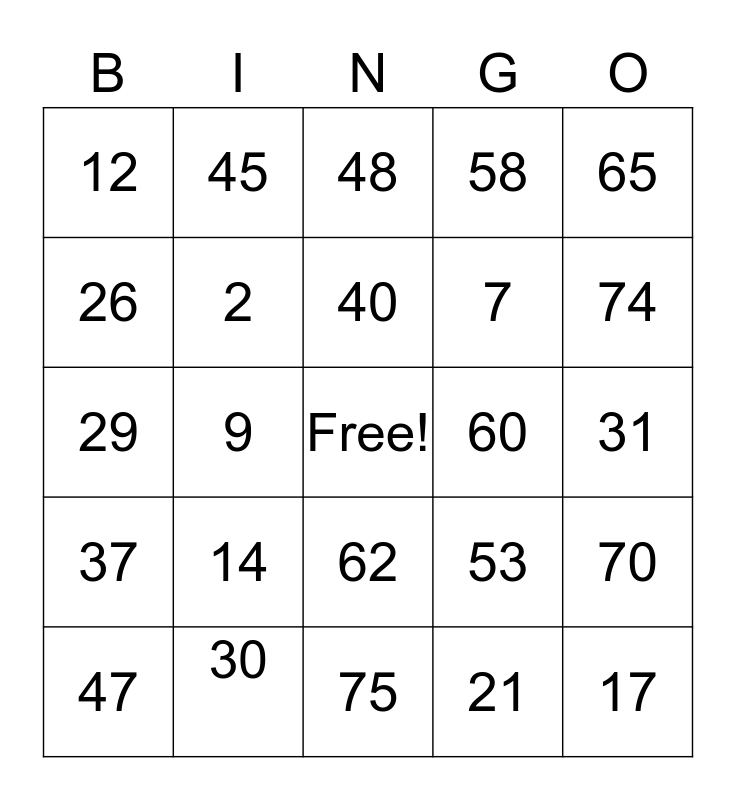 This bingo card has a free space and 24 words: 14, 30, 40, 47, 65, 12, 26, 45, 60, 62, 7, 29, 53, 70, 2, 21, 31, 48, 74, 9, 17, 37, 58 and 75.